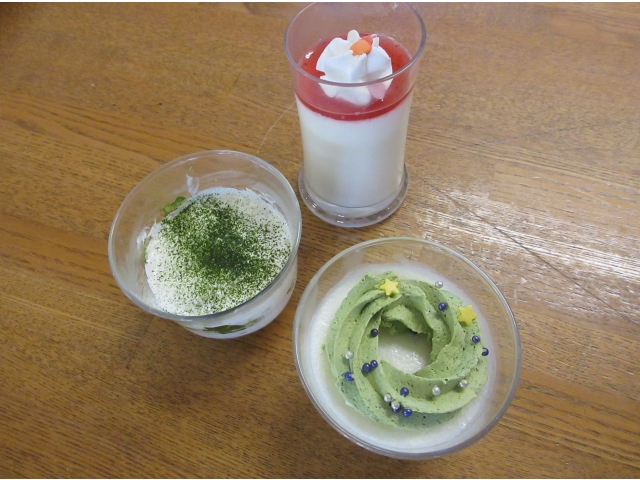 今回私たちは、牛乳ゼリーと抹茶ティラミスを作りました!