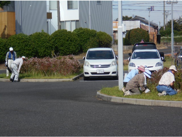 9月18日朝からいつもカラオケボランティアで来ていただいている八寿会の皆様と施設入居者様、職員とで施設駐車場の草刈りを行いました。
