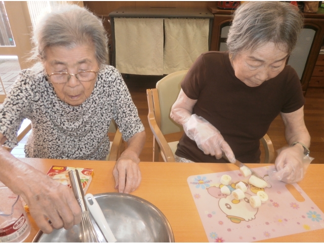 介護職員に作り方の説明を聞きながら、「中に入れるフルーツは何にしようか」バナナに決めたが「細かくする?」「どうするかね?」「面倒だからぶつ切りにしていれちゃえ!!」等、笑いながら会話も弾みました。