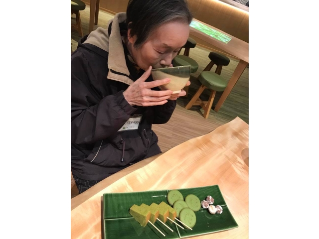 見学後、抹茶を使ったお菓子をつまみながら、お抹茶をいただきました。