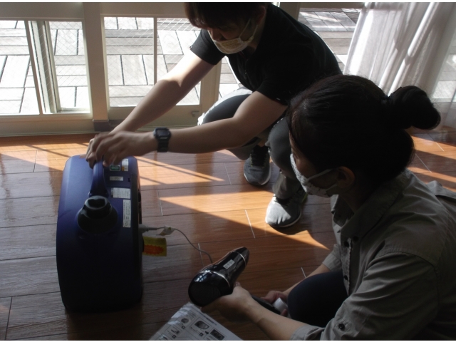 現在西尾苑には災害時のポータブル発電機が15機ありますが、職員一人一人が使い方を覚えていなければ、いざというときに役に立ちません。そこで、6月の防災訓練の一環として、技術員指導のもと、発電機の操作方法を学びました。技術員の実演の後で、グループに分かれて参加者全員が実際に操作を行いました。