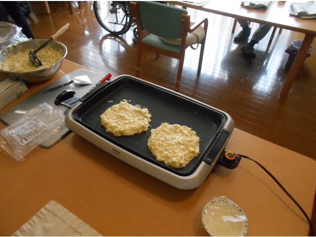 また8月19日にはそら・にじ・なでしこユニットで、お好み焼きを提供しました。こちらもホットプレートを使ってユニット内で調理しました。焼いている音や、匂いに誘われ待ちきれない様子の入居者様も見られました。ソース・マヨネーズはお好みで、出来立てのお好み焼きを美味しそうに召し上がっていました。普段は食事量が少ない入居者様が、この日の昼食は完食していたり、1枚では足りず何枚も召し上がった入居者様もいらっしゃいましたりと、こちらも皆様に大変満足していただくことができました。