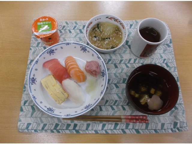 そして、10月29日には「秋祭りフィナーレ」として昼食に握り寿司を提供しました。まぐろ、サーモン、たまご、いなりなど、厨房の方が1つ1つ丁寧に握った手作りです。食形態に合わせることで、全員分提供することが出来ました。