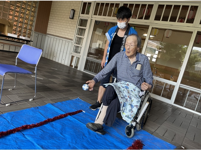 投げることが難しい方はスロープを使って職員と一緒に投げました。