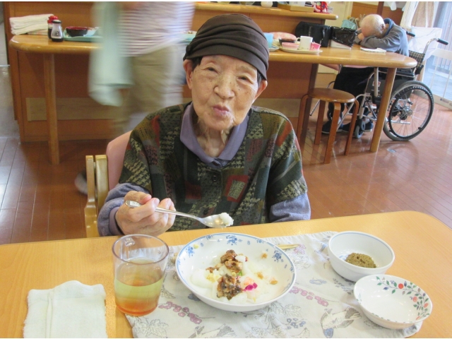 飾り切りされた野菜をみつけて「豪華だねぇ」「きれいだねぇ」と感心しきりの入居者様。お寿司🍣のお味はもちろん、見た目も素敵なランチでした。
