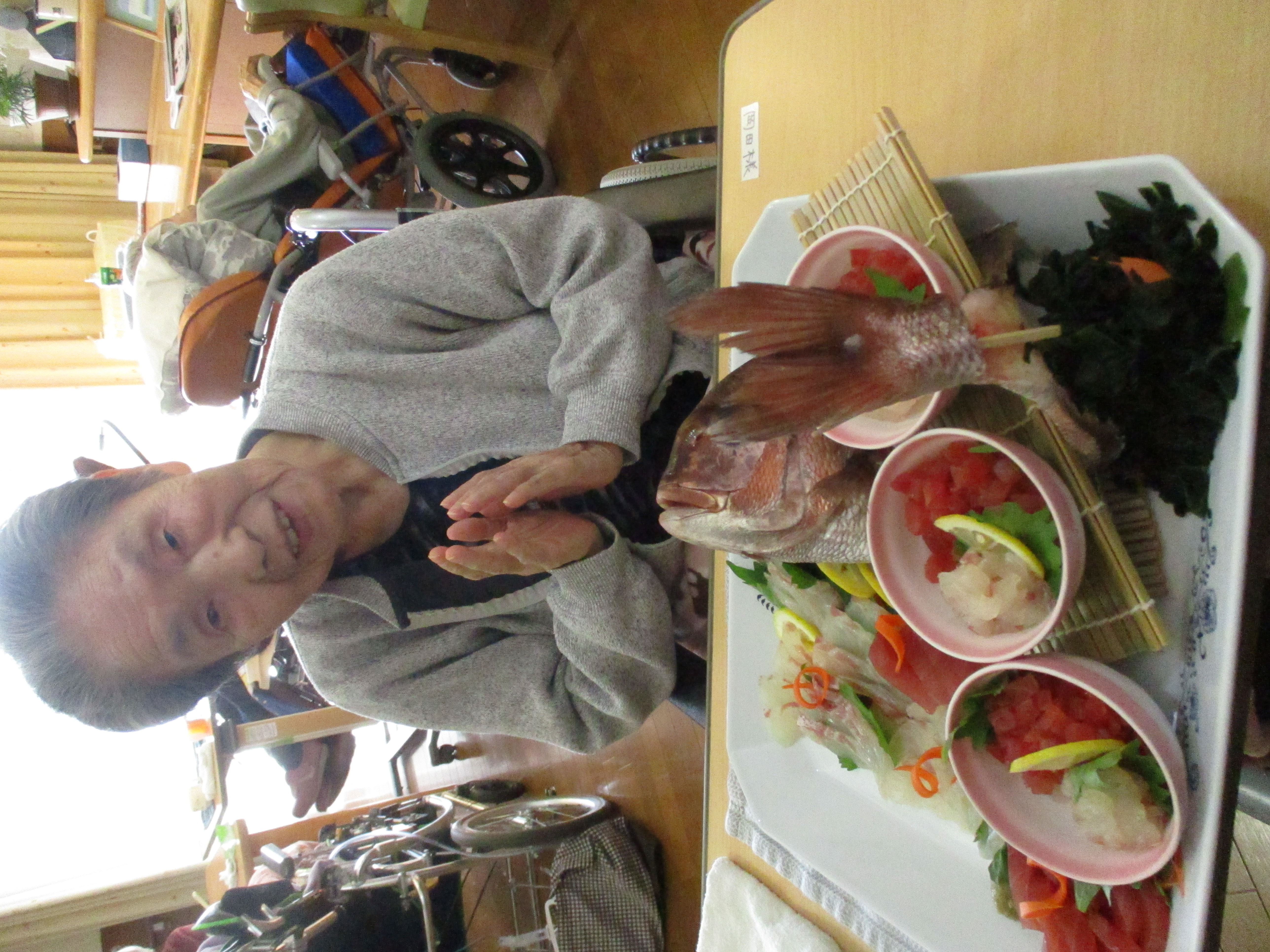 食事形態がまちまちな入居者様全員がおいしく楽しく食べられる料理ということで、ユニットスタッフが「栗ご飯・刺身・茶碗蒸し」のオーダーをしていました。