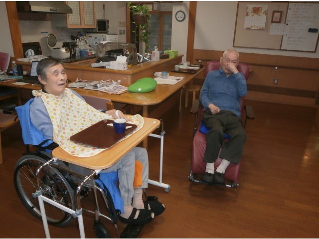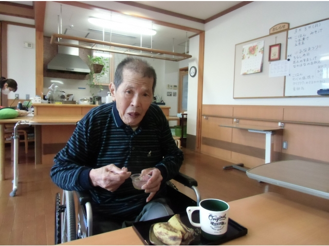 - こちらは湯上りにおやつの様子です。お茶にバナナに冷たいゼリーと盛りだくさんですね。リビングにおいでにならない事も増えましたが、こうして皆様と過ごして下さる事もあります。