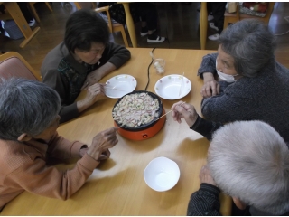 ある日の利用者さんの何気ないその一言で今月の手作りおやつウィークはたこ焼きに決まりました。以前はお台所を切り盛りしてきた利用者さんも今となっては包丁を握る機会もなくなってしまったと話すかたも多いのですが、キャベツをリズムよく刻む姿はとても生き生きとされていました。できたてアツアツのたこ焼きを頬張り「初めて食べた!」「うまかった~」とうれしい声が聞こえてきました。