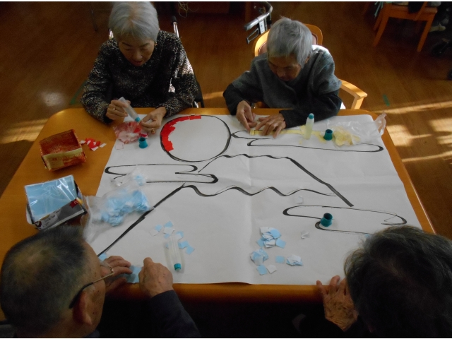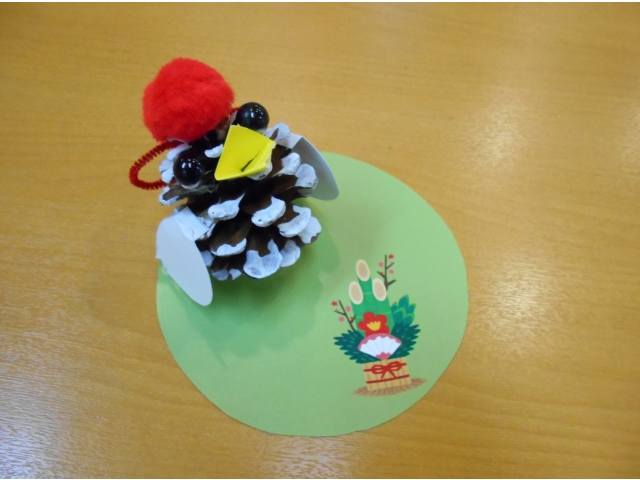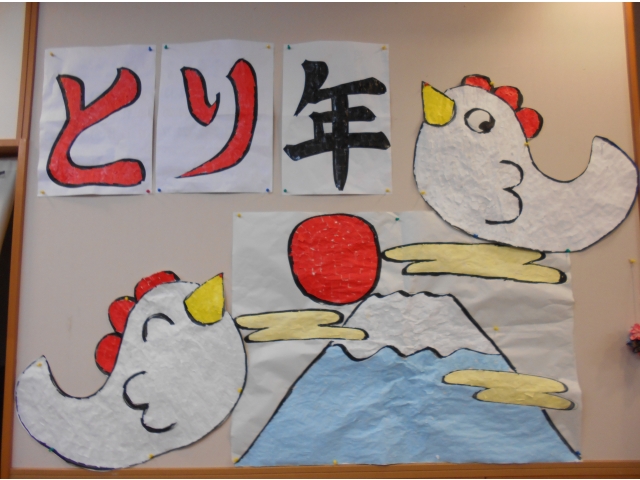新年の準備ではお正月にふさわしい壁紙つくり。今年は酉年、おめでたい富士山も一緒にちぎり絵で制作しました。まつぼっくりを使った干支飾りにも挑戦です。