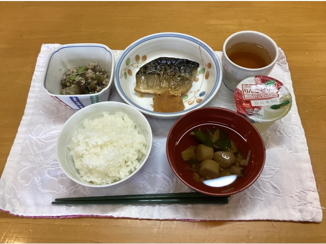 ・鯖の塩焼き・茄子のそぼろ煮・すまし汁・ごはん・りんごゼリーエネルギー474kcal、たんぱく質25.5g、脂質16.1g、炭水化物63.5g、食塩1.5g
