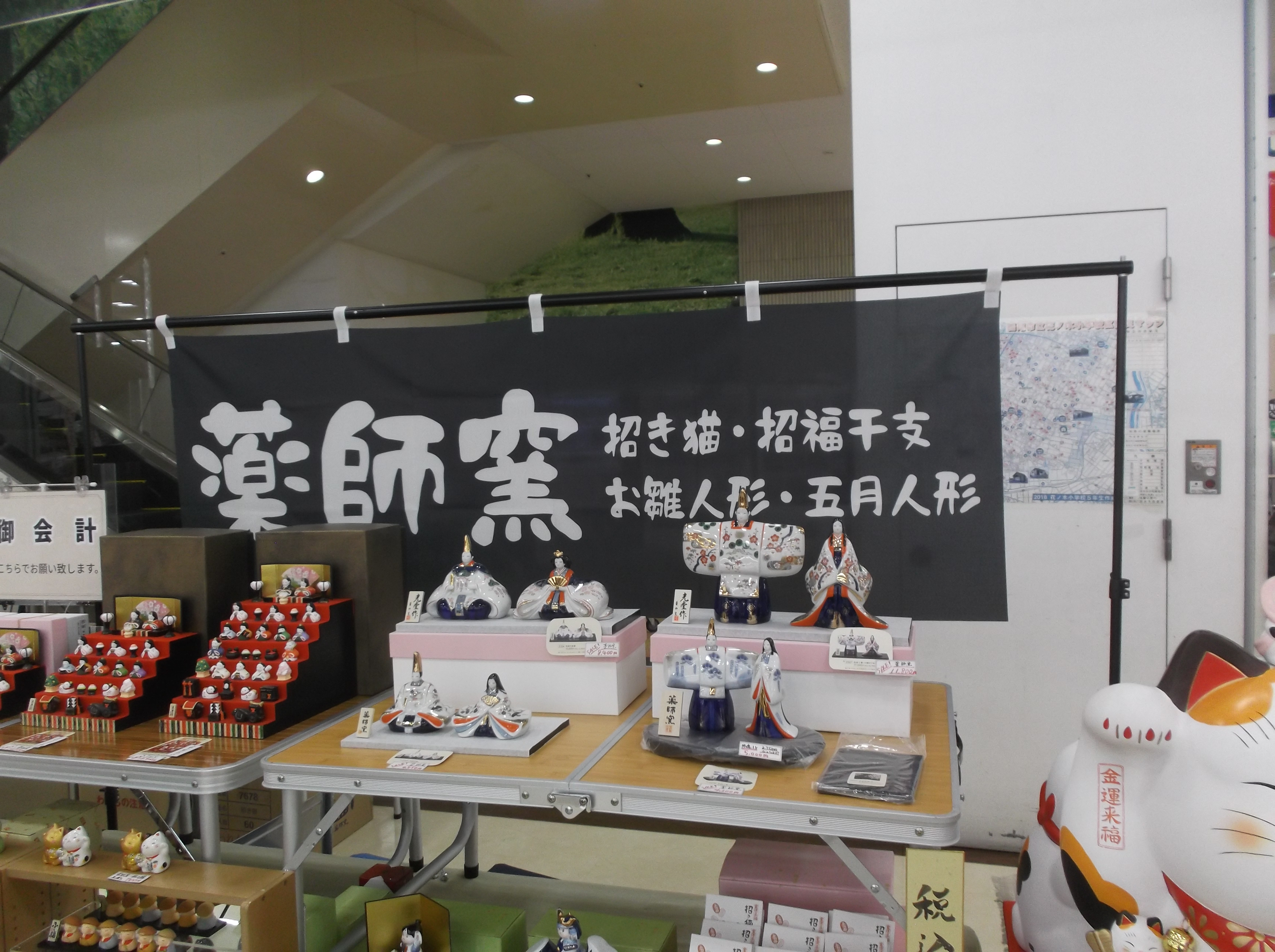 店頭で素焼き人形を販売していました。「招き猫を撫でてください」の貼紙に誘われ、皆で招き猫を撫でました。