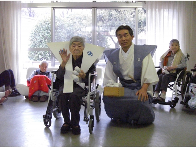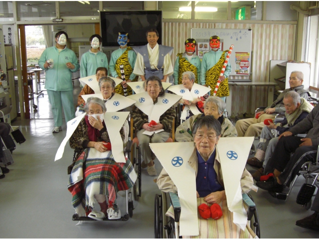 2月6日(水)に愛厚ホーム大府苑にてちょっと遅い節分会を実施しました。 日本福祉中央福祉専門学校の実習生にも鬼役で参加してもらい、 「鬼はそと~、福はうち~」の掛け声で豆まきをしました。 今年は10名の年男年女がいましたが、みなさん楽しそうに福が来るようにと豆をまいていました。今年も元気で楽しく暮らせますように。