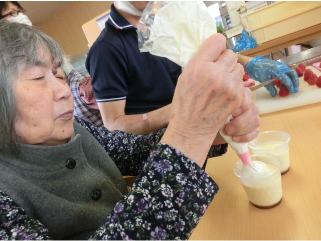 今日はクリスマス会!今年はみんなでプリンを作ります。生クリームをくるくるっと絞ってフルーツを山盛りに飾り、手についたクリームはペロっと…