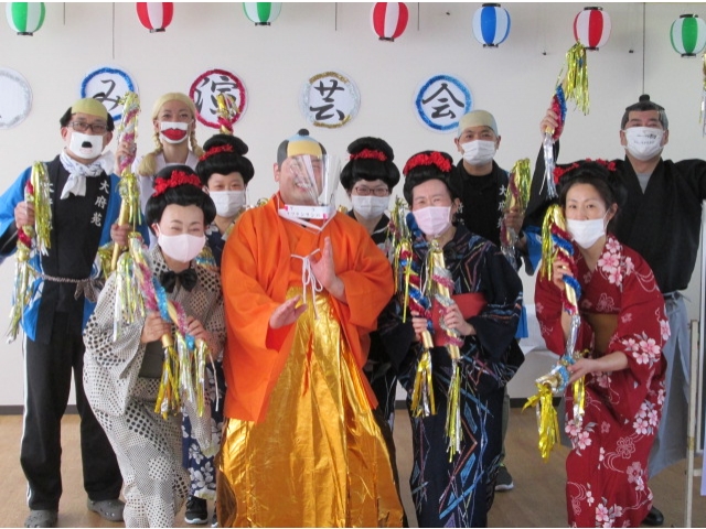8月5日13時30分から、利用者様にはお知らせしていないサプライズの形で、お楽しみ演芸会を開催しました。利用者様に楽しんでいただけるように、仕事終わりなどに練習を重ねてきました。演芸の休憩時間には、豆腐田楽とかき氷を味わいながら、職員の演芸をたくさんの笑顔で楽しまれていました。