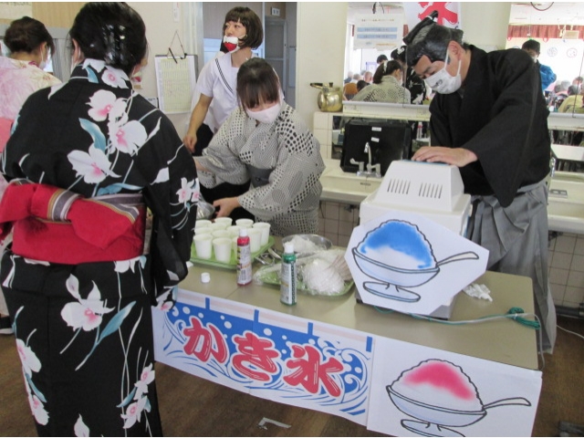 - 演芸の衣装や浴衣姿の職員が、冷たいかき氷を作りました。