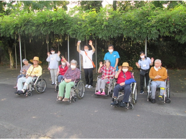 10月2日水曜日の午後、秋晴れで過ごしやすい陽気に誘われ、苑内を散歩し藤棚の下で体操を行いました。お互い適度な距離をとりつつ、秋晴れの青空の下体操を行うととっても気持ちが良かったです。秋を感じながら過ごした午後のひと時でした。