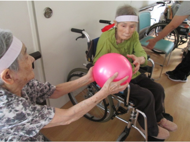 - 手を伸ばして、ボール送りゲームを楽しみました。