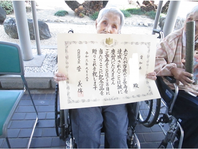 大府苑に入所しているご利用者様へ、満100歳のお祝いに内閣総理大臣より、お祝い状と記念品(銀杯)が届きました。