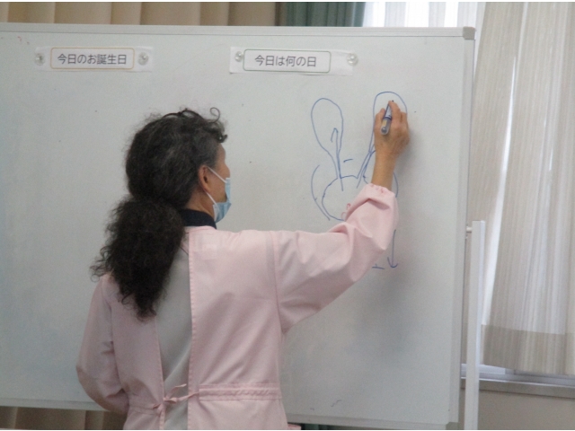 バルーンカテーテルについては、具体的な図もホワイトボードに描きながら、尿が溜まる仕組みや取り扱いの注意、畜尿バッグの固定方法などについてわかりやすい説明がありました。