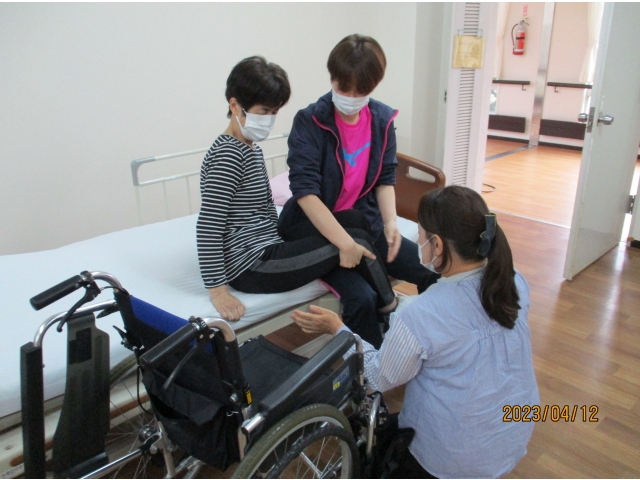 - 職員が交代で、ノーリフティングでの移乗を練習しました。