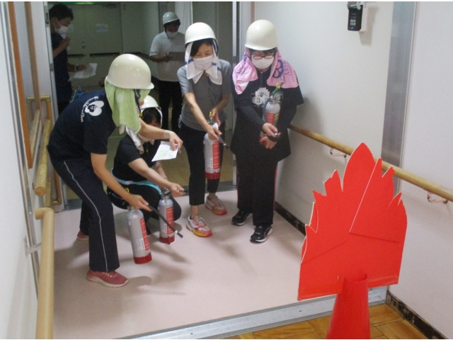 午後2時に火災報知器が鳴り、出火場所の確認と現場の確認を行い、消火器を手に初期消火訓練を行ないました。