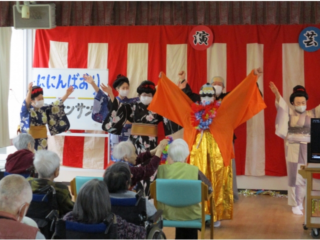 去年からの計画が延期になっていましたが、2月29日に苑内で演芸会を行いました。普段、外出やご家族との交流の機会も少ない中で、入所者の皆様に少しでも楽しんでいただこうと、職員が計画しました。