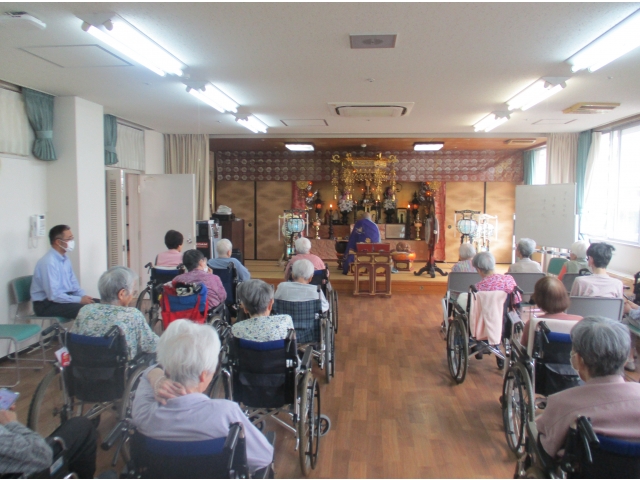 9月24日(火)10時から、浄通院のご住職をお招きして、お彼岸法要として、9月の月例祭を行いました。 お経を唱えていただいている間に、職員・ご利用者様が順番にお焼香を行いました。 最後に、般若心経やお施餓鬼についてお話があり、お彼岸は命への感謝と命の使い方を間違えないように考えることが大切と教えていただきました。