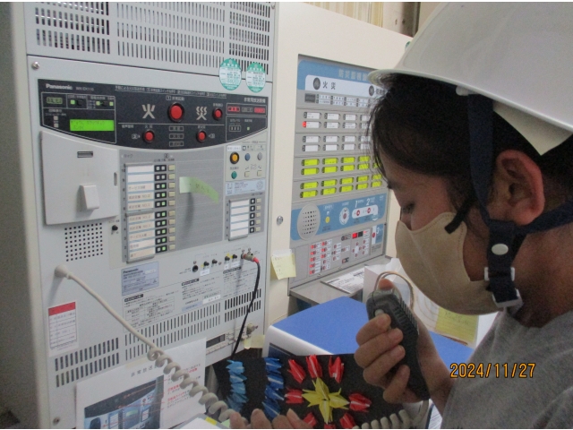 非常ベルが鳴り、出火場所を確認。現場を確認し、協力して初期消火訓練を行いました。