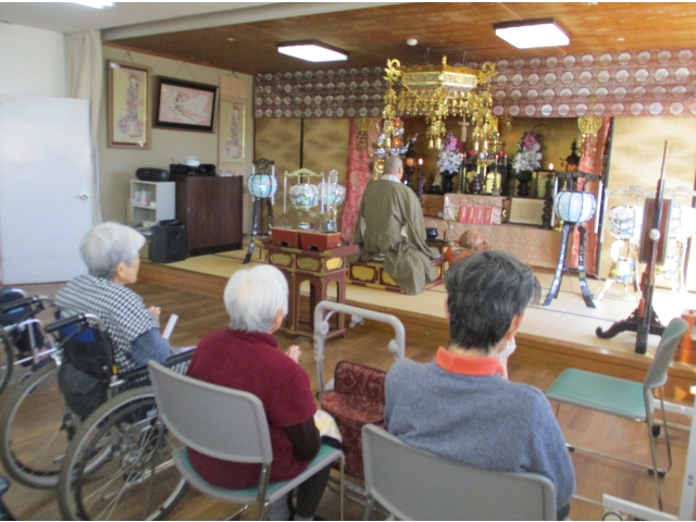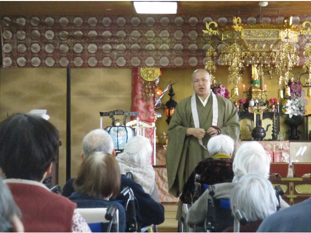 今月は延命寺さんが来てくださいました。月例法要を担当されるお寺さんの中では珍しい天台宗とのことです。ご住職が経験された、比叡山で修行のお話、回峰行のお話などを聞かせていただきました。