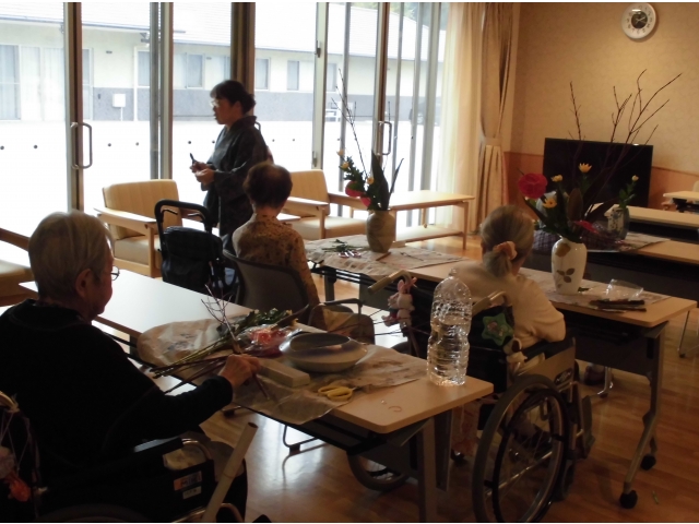 入居者の皆さん、真剣なまなざしでお花と向き合っています。