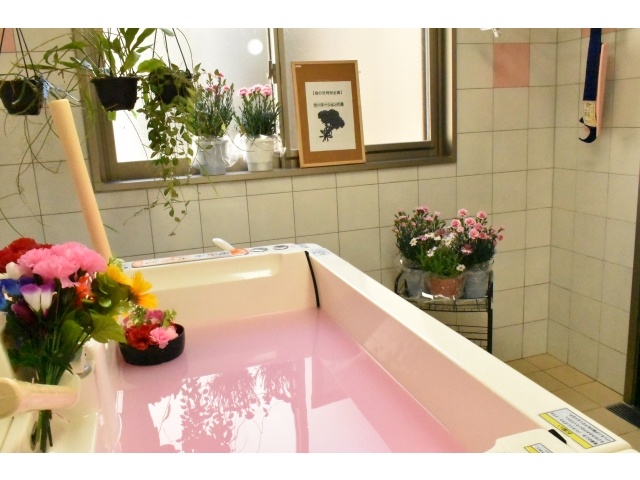 お風呂場には、カーネーションの花を飾り、浴槽のお湯にはピンク色の入浴剤を入れてかわいらしく準備しました。また浴槽にはお花を浮かべました。💐