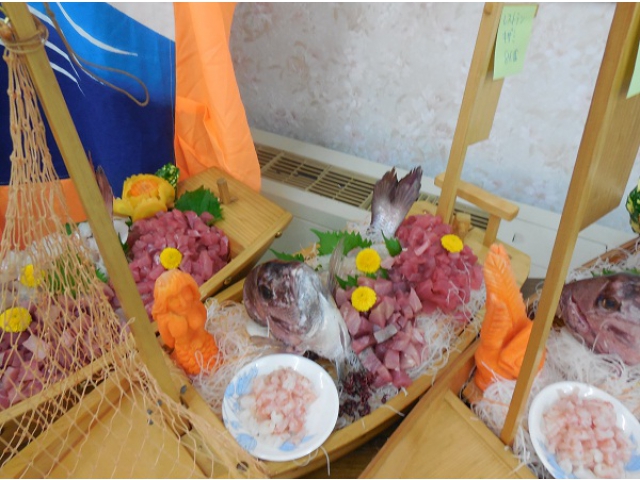 11月26日の昼食は、なんと舟盛りでした!生の新鮮なマグロ、ブリ、鯛を丸々取り寄せ、調理師の見事な手さばきで、どんどん解体されました。鯛は泳いでいるかのような姿で、野菜の飾り切が脇を華やかにし、とても美しい舟盛りになりました。