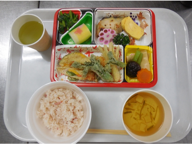 4月3日の昼食はお花見弁当でした。お弁当の中身は姫たけ、タラの芽、チキン巻、かぼちゃの天ぷら盛合せと、鰆の西京焼き、だし巻き玉子、ふきと筍の煮物、菜花の胡麻和え、ねりきりと盛りだくさんです。桜ごはんと清汁も付いて春の雰囲気満天です。調理師総出でお弁当作りに励みましたが、当日は残念ながら雨が降ってしまい、利用者の皆様には室内で召し上がっていただきました。外でお花見をしながら食事はできませんでしたが、皆様からは「綺麗ね、おいしいよ」と大変嬉しいお言葉をいただくことができました。