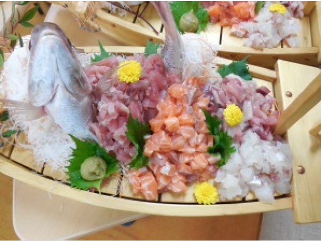 11月25日は舟盛り食の提供をしました。 マグロ・ブリ・鯛・キングサーモンの4種類をご用意し、調理師総出で捌きました。年に一度の舟盛りに利用者の皆さんは大興奮。『わたしは鯛が多めで!わたしはぶり!』などのリクエストや『わさびがツーンとなるのがいいのよね(8分音符)』など会話もいつも以上に弾んだご様子でした。