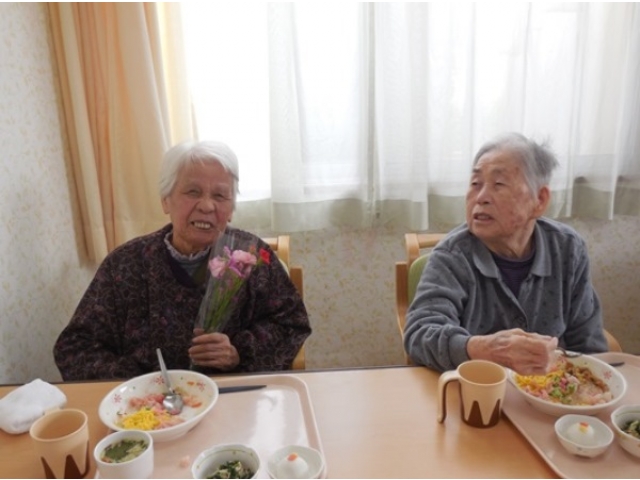 11月10日に誕生会を行いました。今月の誕生会のお食事は、利用者様のリクエストによりちらし寿司、茶碗蒸し(ゆりね)、ほうれん草のお浸し、お饅頭でした。