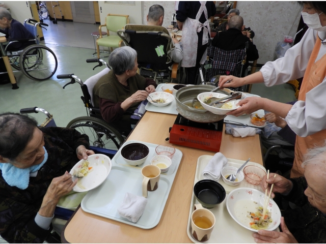 12月5日(水)の昼食は鍋料理でした! 今回は塩ちゃんこ鍋で、中には調理師さんお手製の肉団子も入れました。 利用者様はお鍋が好きな方が多く、席に土鍋が置かれると「中身は何かな~」と思わず笑みがこぼれていました。 おかわりを何回もされている方もお見えになり、とても喜んでいただくことができました。 今年度はあと2回鍋料理の日があるので、楽しみにしていてください。