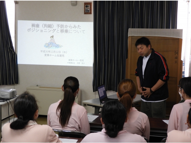 平成30年12月12日に、愛厚ホーム一宮苑の作業療法士 中野智之氏をお招きし、「褥瘡(拘縮)予防からみたポジショニングと移乗について」をテーマに、職場研修を開催しました。