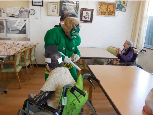 2月1日、節分会を行いました。 年男、年女の方には今年の抱負を話していただきました。その後、赤鬼、青鬼が現れ、豆まきをして退治しました。暦の上では明日から春ですが、寒い日が続くので、風邪をひかないように気を付けましょう。