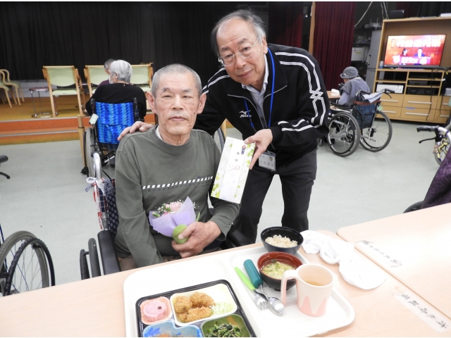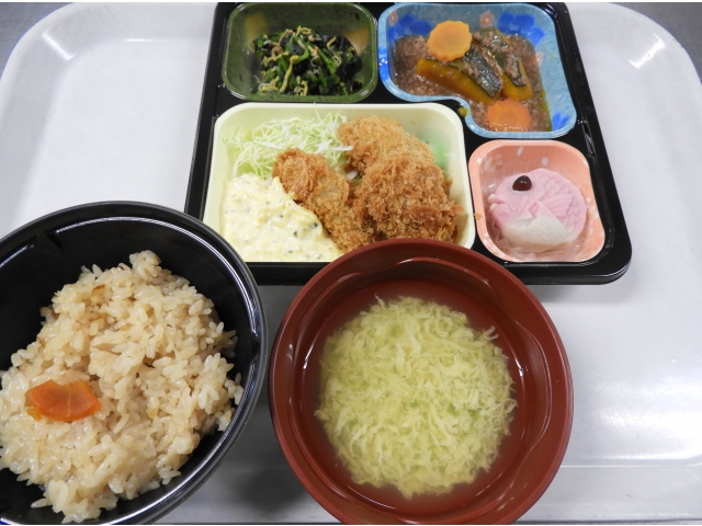 12月の誕生者は、5名見えました。 誕生月の方からカキフライが食べたいと要望もあり、本日の昼食は、五目ご飯、カキフライ、南瓜のそぼろ煮、ほうれん草のしらす和え、かき玉汁、饅頭を提供しました。