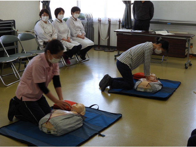 令和2年1月29日、当苑におきましてAEDと人形を使用した救命訓練を実施しました。愛西市消防本部から職員を派遣していただき、60分という短い時間ではありますが参加された職員18名全員、真剣かつにこやかにAEDの取り扱い、胸部圧迫と実践しました。 その成果があって充実した内容で実のある講習会となりました。 この取り組みを実践に生かしたいものですね!