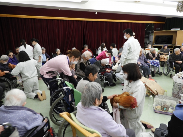利用者の皆さんは膝に犬やウサギ、名古屋コーチン等を乗せてもらい笑顔が溢れます。