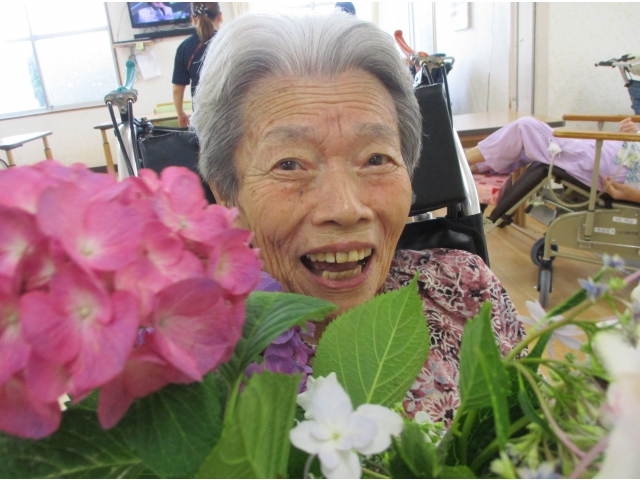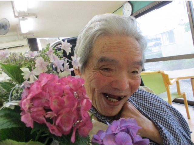 紫陽花を抱えて、はい!ポーズ(^0^)v花に負けない、満面の笑顔が咲き誇りました!コロナウィルスの影響でご家族になかなか会えない利用者様ですが、紫陽花の花ことばのように、「辛抱強い、深い愛情」をもって、元気で明るくお過ごしいただいております!
