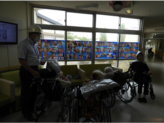 令和2年7月14日、3回目の防災訓練を利用者様参加の防災訓練(夜間想定の部分訓練)を行いました。西棟介護員室から出火し、第二避難所まで避難誘導する計画でしたが、雨天のため食堂前広場までの避難誘導を行いました。 夜間想定で職員が少ない中での初期消火・非常放送・避難誘導と計画通り実施できました。