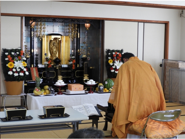 8月12日(水)に西照寺服部導師をお招きし、盆供養が催されました。当日は、利用者が密にならないよう間隔をあけて、物故者の供養を行いました。服部導師様の読経から始まり、しめやかに執り行われました。