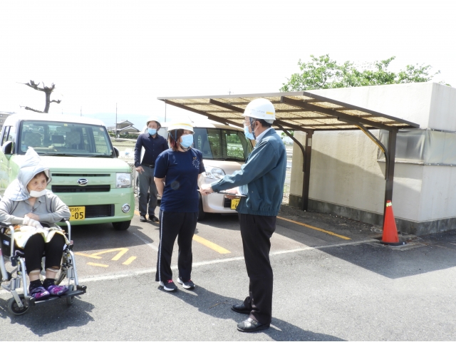令和3年5月10日 晴天の下で2回目の防災訓練を実施しました。 昼間に東棟介護員室から出火、避難所まで利用者様を避難誘導する想定で今年度配属された職員を加えて実施しました。15分程度の訓練でしたが事故もなく無事終了しました。 日頃からこういった訓練を繰り返すことで、施設として防災の意識を高めていきます。