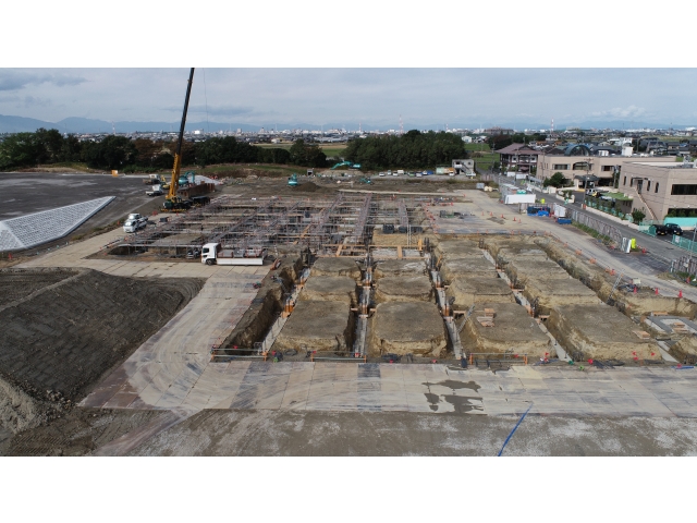 10月中旬に杭打ち工事が終了し、基礎工事が始まりました。ドローンを使い上空から撮影すると、完成図と同じ形になってきました。毎日少しずつ工事が行われており、来年の夏の完成が楽しみです。