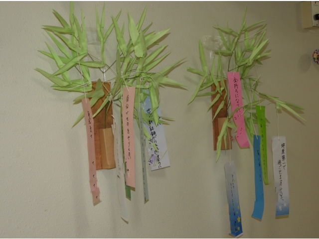 もうすぐ七夕。廊下に利用者の方の思いを短冊に込め飾りつけをしました。