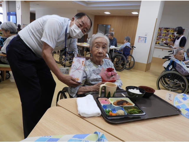 8/18に、新施設では初めての誕生会を行いました。 食事メニューは、☆味噌カツ☆鶏しんじょうの炊き合わせ☆えびアスパラのサラダ☆すまし汁☆祝いまんじゅう 今月は10名の方が誕生日を迎えられました。 これからも元気にお過ごしください。
