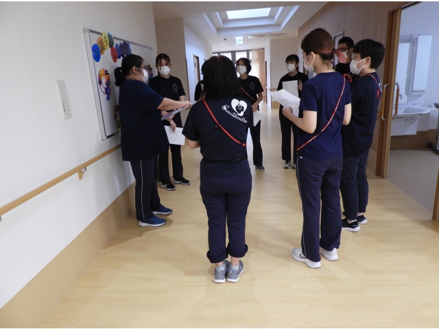 10月5日 改築後施設環境が変わったこともあり介護職員の緊急時対応について、主査を講師として実施をまじえて行いました。 発見から吸引器・酸素・AED等の準備と、模擬実技を夜勤4名の役割を基に交代して行いました。