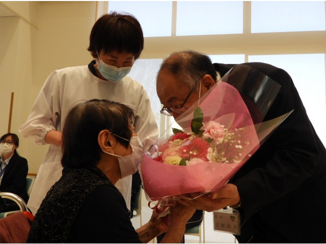3月31日苑長はじめ転出者8名・退職者2名のお別れ会を行いました。一人づつあいさつをされ、利用者の皆さんから花束の贈呈がありました。 新しい環境でも元気に頑張ってください。